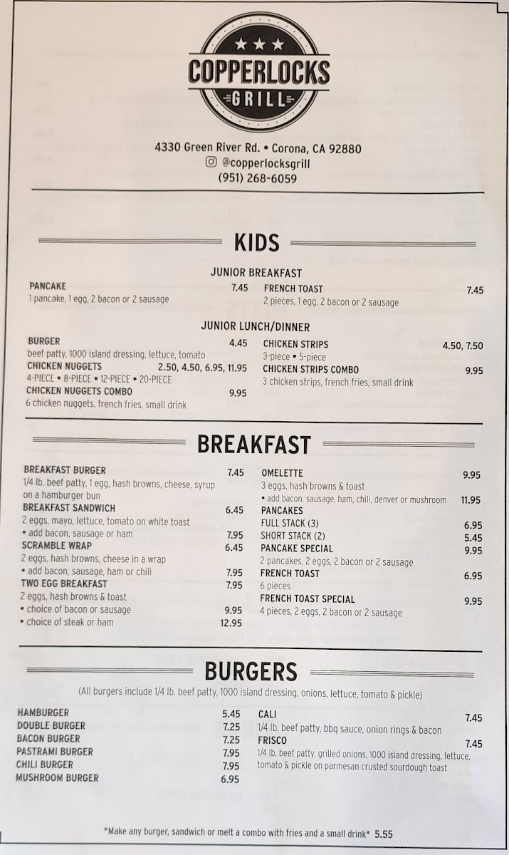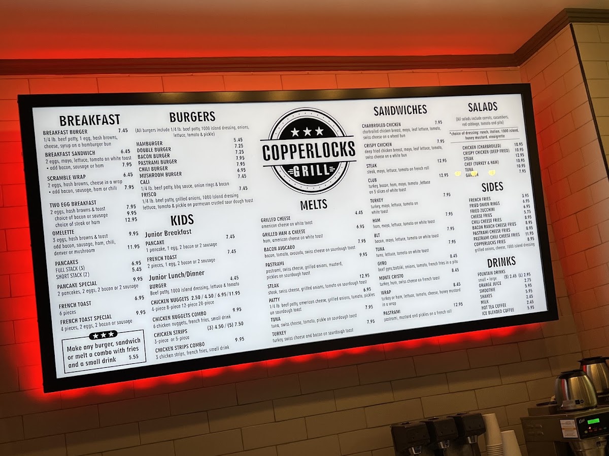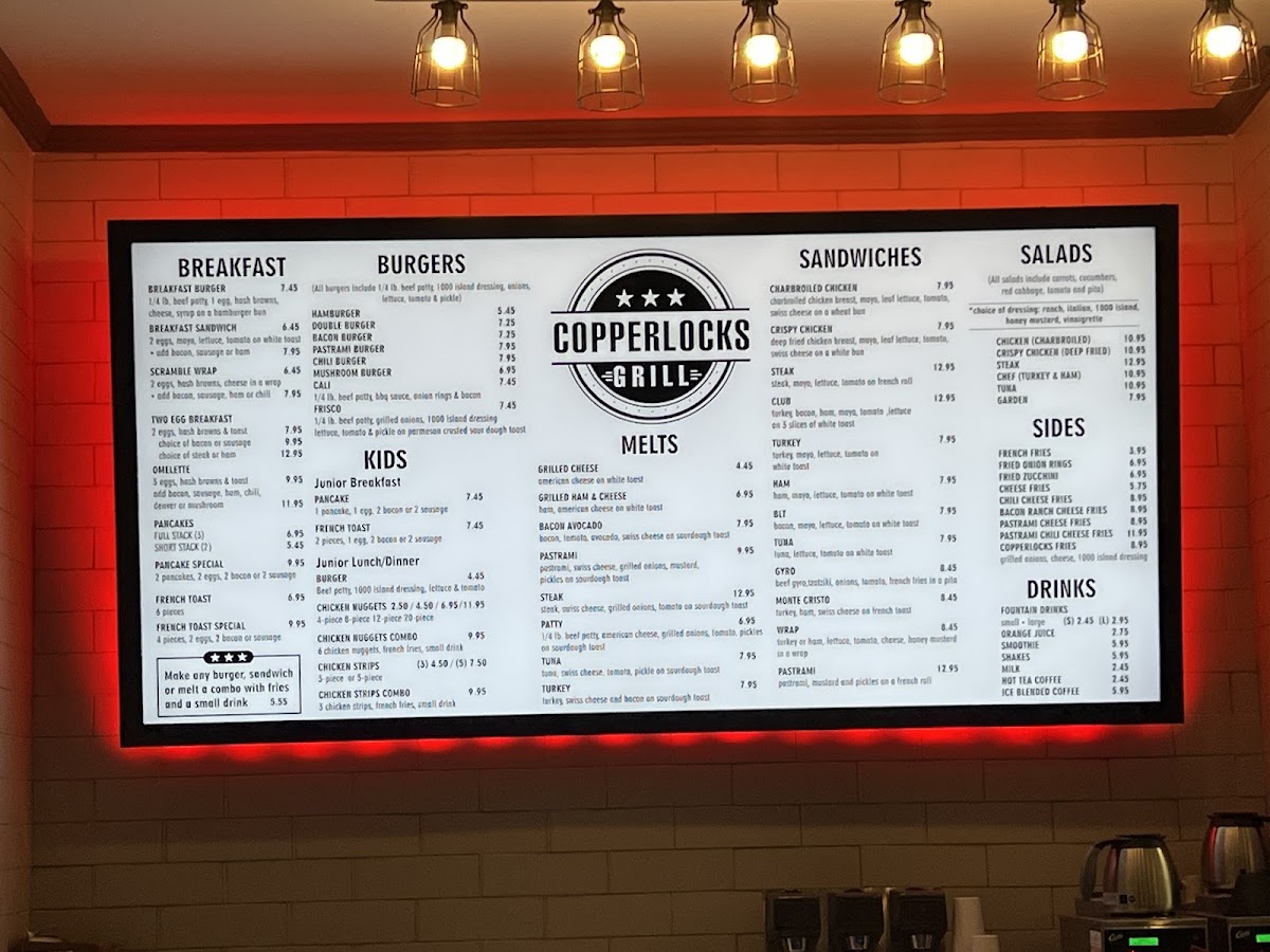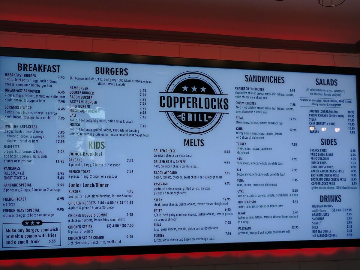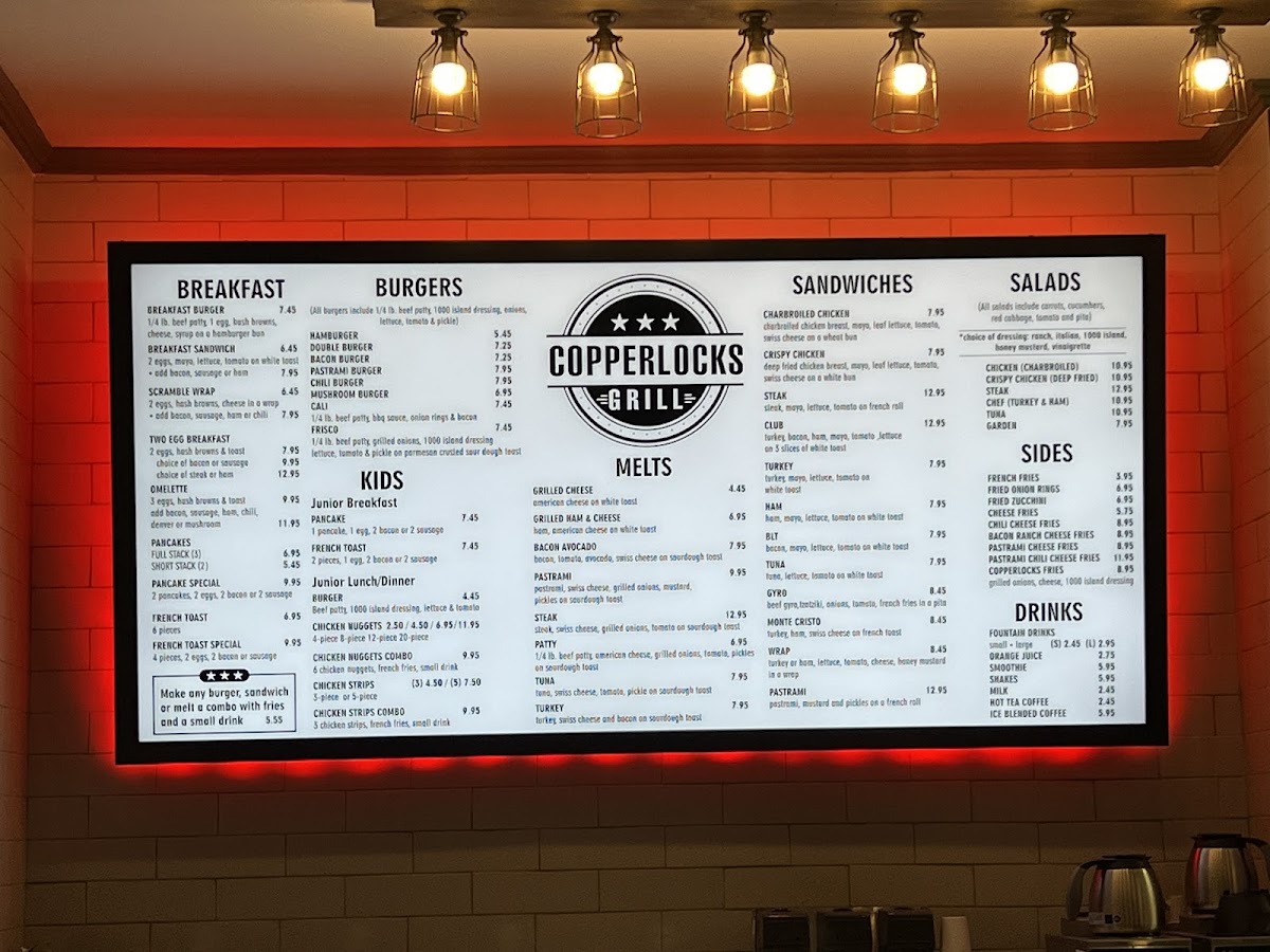 The menu at Copperlocks Grill reflects a classic American diner style—comforting, straightforward, and satisfying. It’s a thoughtfully curated selection of casual bites and hearty favorites that suit any time of day, whether you’re stopping by for a laid-back breakfast, a midday lunch, or an early dinner with friends or family.